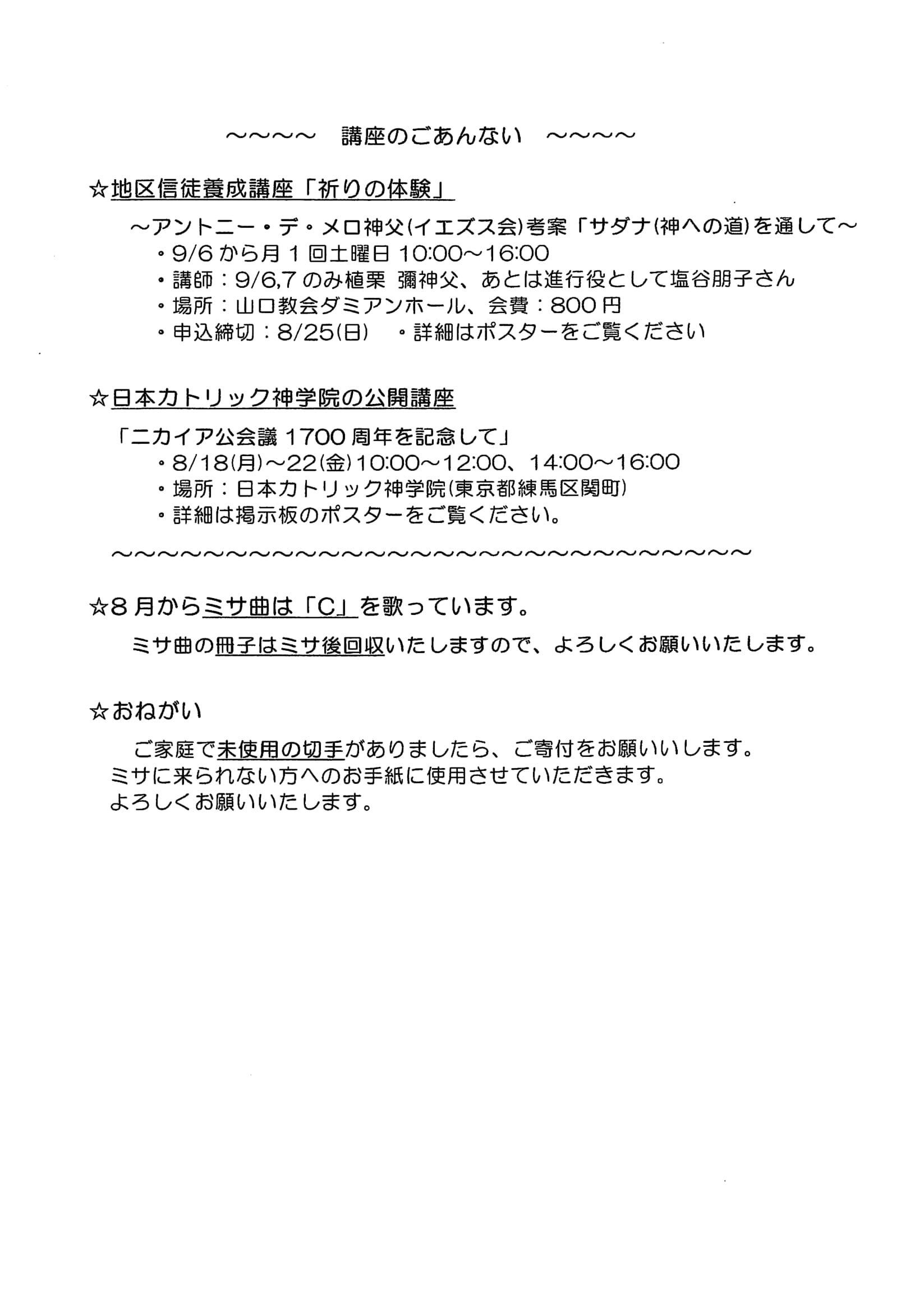 年間第20週(8/17~8/23)のお知らせです。