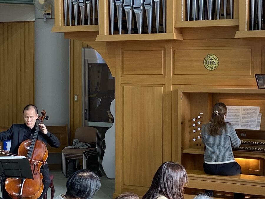 チェロの中村仁さん、オルガンの松本いずみさんのおふたりに、バロックやロマン派の本格的な楽曲から親しみやすいオペラのアリアや映画音楽まで、瑞々しい演奏を披露していただきました。演奏会の初めには、パイプオルガンビルダーから、オルガンの音の出る仕組みの解説もありました。