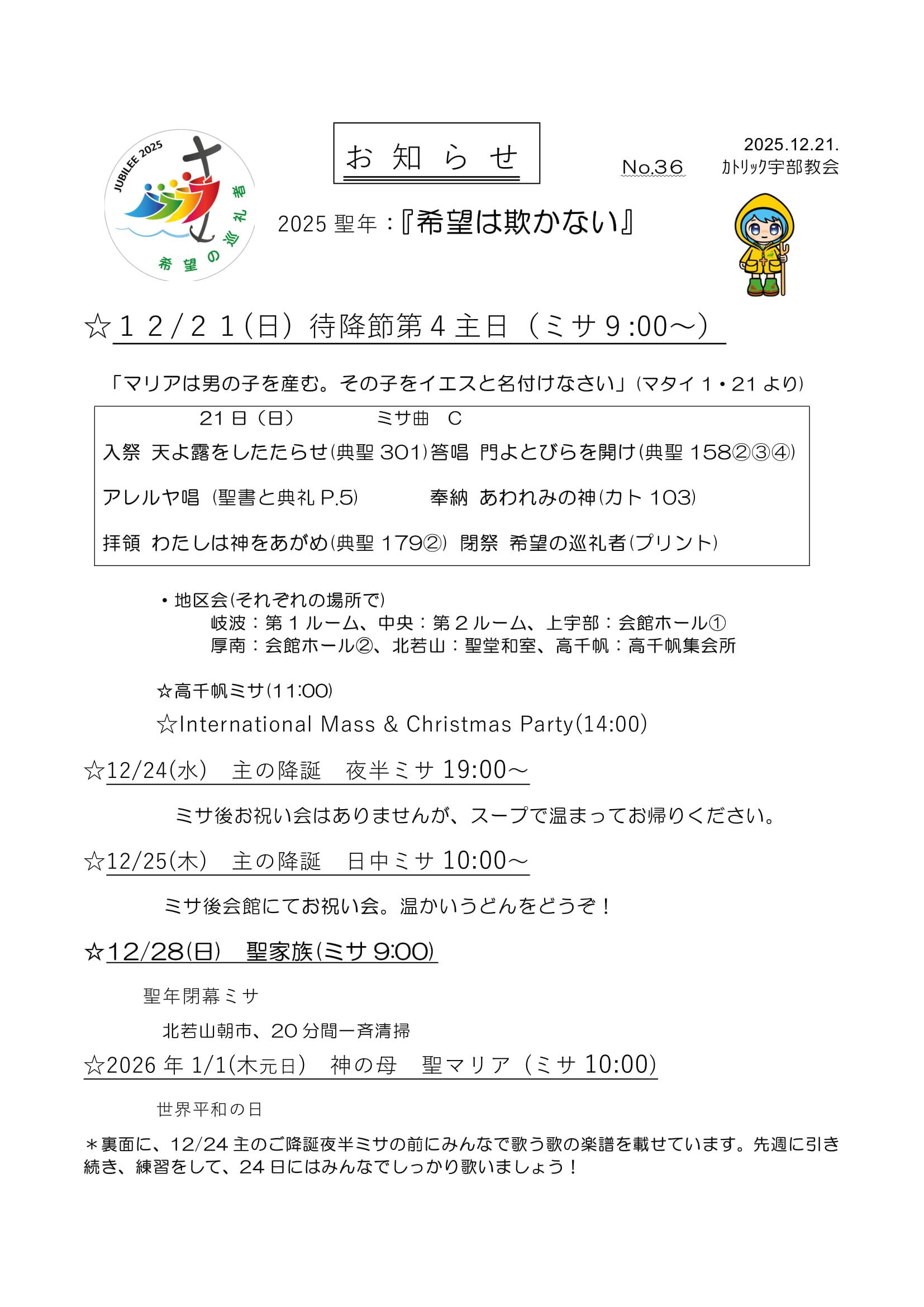 待降節第4週および主の降誕の祭日の週(12/21~12/27)のお知らせです。
