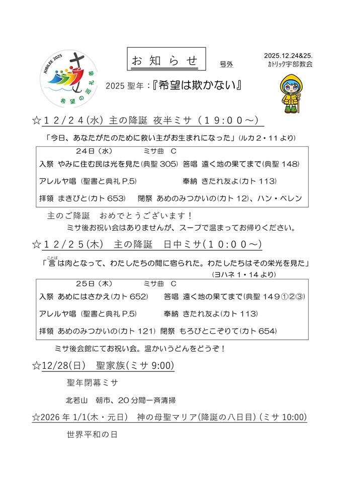 主の降誕~神の母聖マリア(12/14~2026/1/1)のお知らせです。