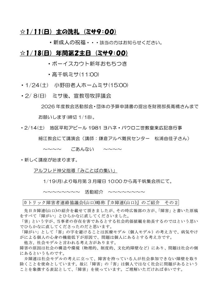 主の降誕後第1主日の週(12/28~1/3)のアナウンス