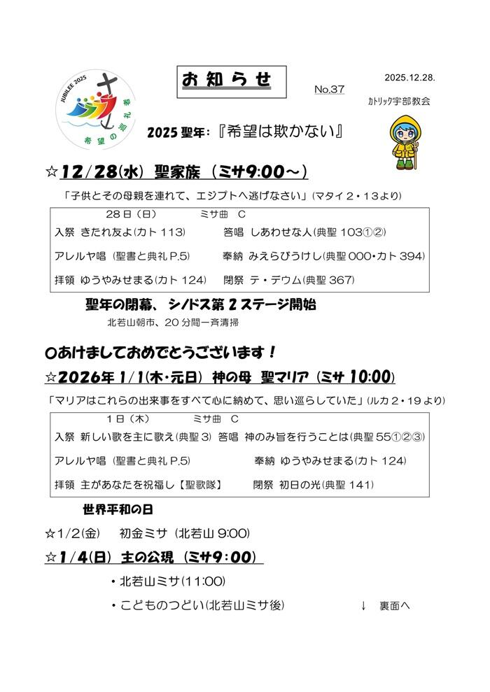種の降誕後第1主日の週(12/23~1/3)のお知らせです。