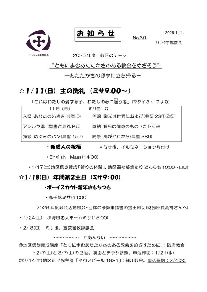 主の降誕後第主日と年間第2週(1/11~1/17)のお知らせです。