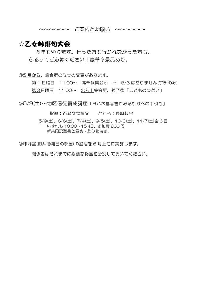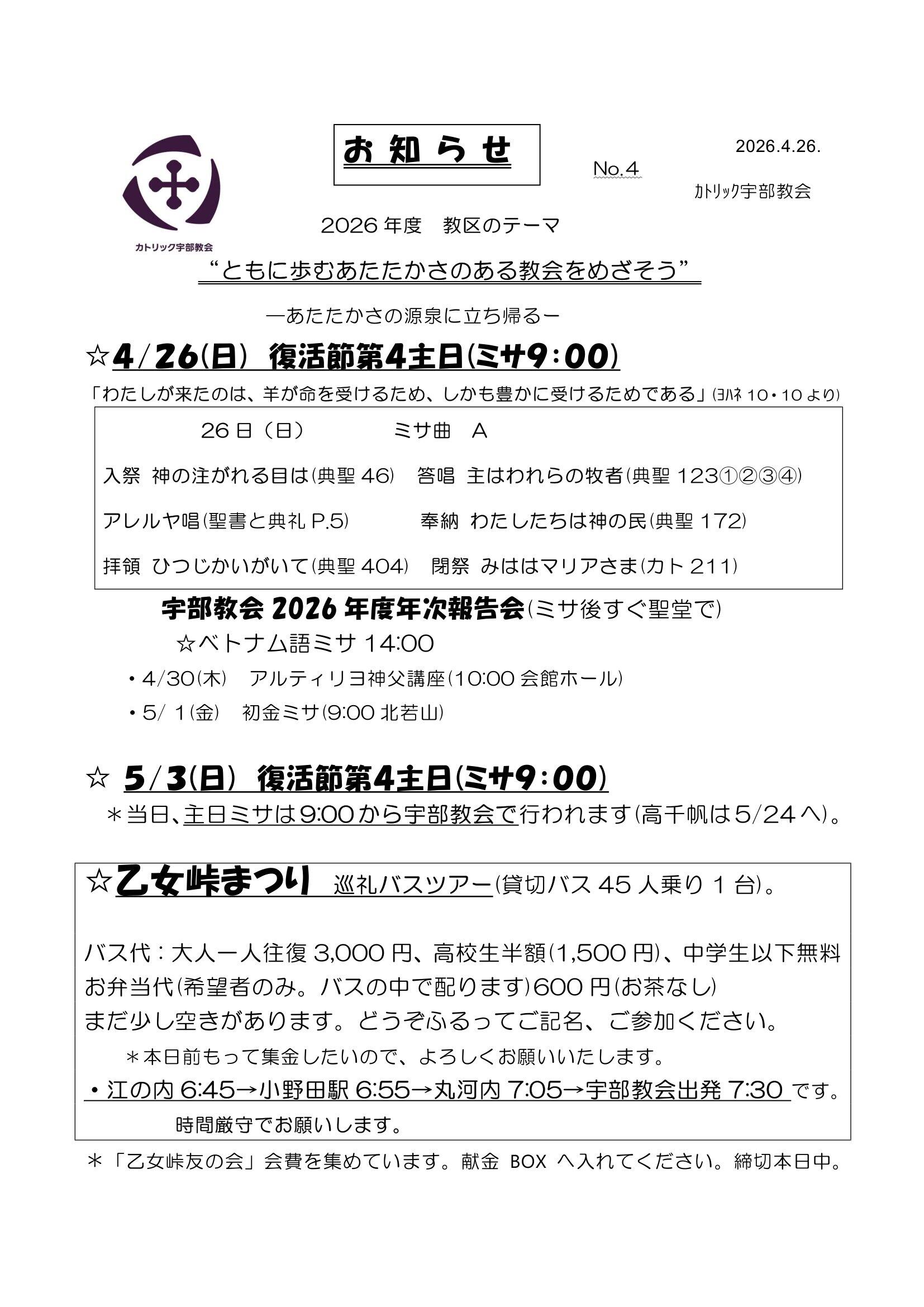 復活節第4週(4/26~5/2)のお知らせです。